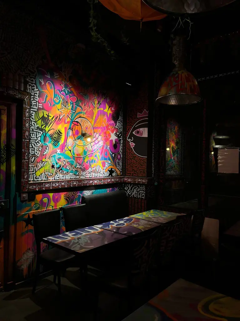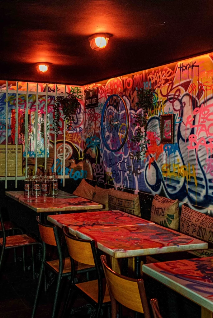 Imprégné de Street Art, les clients eux-mêmes sont invités à laisser leur trace, participant ainsi pleinement à l’histoire du lieu.